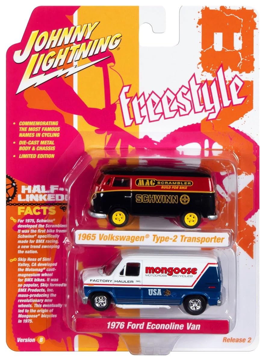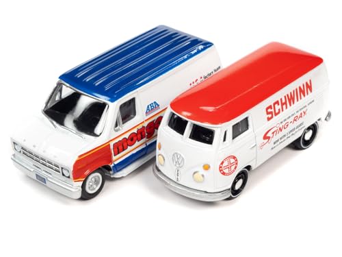 1965 Type 2 Transporter Van White w/Red Top Schwinn & 1976 Econoline Van White w/Red & Blue Graphic Mongoose Team BMX Set 2 Cars 2-Packs 2023 Release 2 1/64 Diecast Johnny Lightning JLPK022-JLSP342A