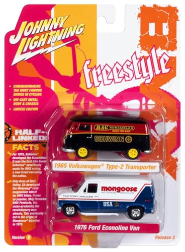 1965 Type 2 Transporter Van Black Schwinn & 1976 Econoline Van White Mongoose USA Factory Team BMX Freestyle Set 2 Cars 2-Packs 2023 Release 2 1/64 Diecast Cars Johnny Lightning JLPK022-JLSP342B