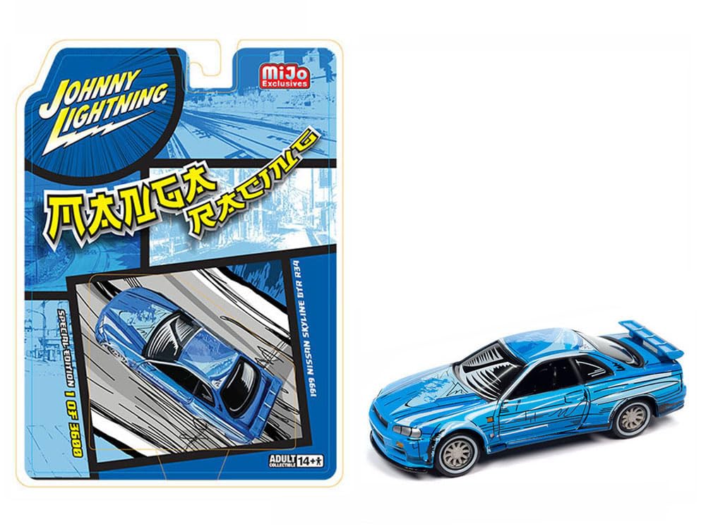 1999 Skyline GT-R (R34) RHD (Right Hand Drive) Blue with Graphics Manga Racing Limited Edition to 3600 Pieces Worldwide 1/64 Diecast Model Car by Johnny Lightning JLCP7455