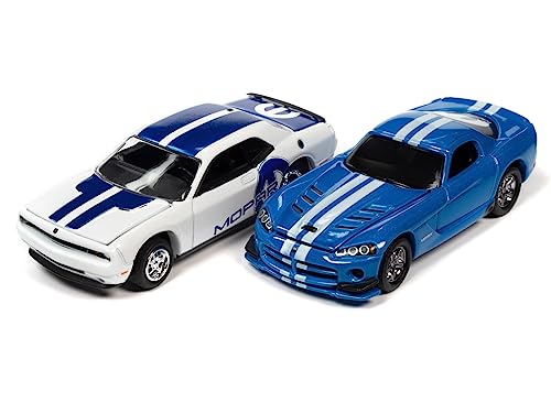 2014 Challenger R/T White with Blue Stripes & Graphics & 2008 Viper SRT10 Blue Metallic with White Stripes Set 2 Cars 2-Pack 2023 Release 1 1/64 Diecast Model Cars by Johnny Lightning JLPK020-JLSP319A