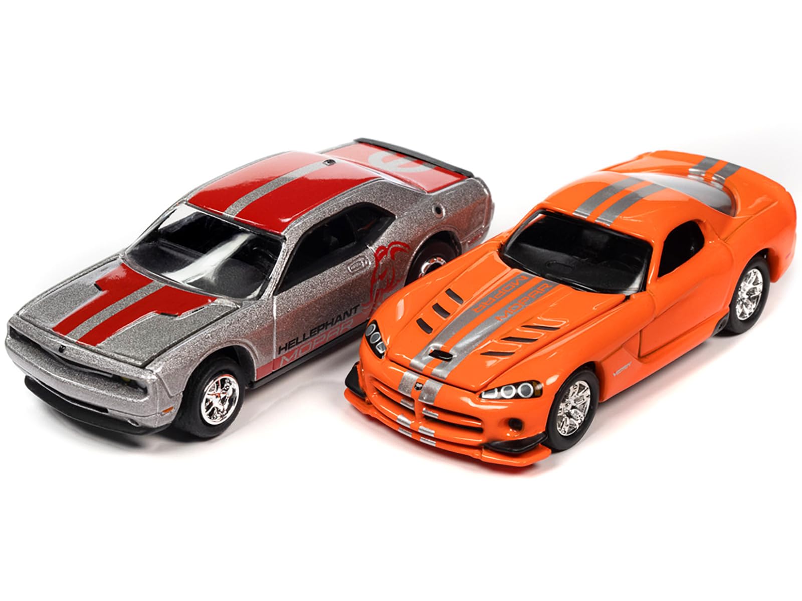 2014 Challenger R/T Hellephant Silver with Red Stripes & Graphics and 2008 Viper SRT10 Orange with Silver Stripes Set 2 Cars 2-Packs 2023 Release 1 1/64 Diecast Cars Johnny Lightning JLPK020-JLSP319B